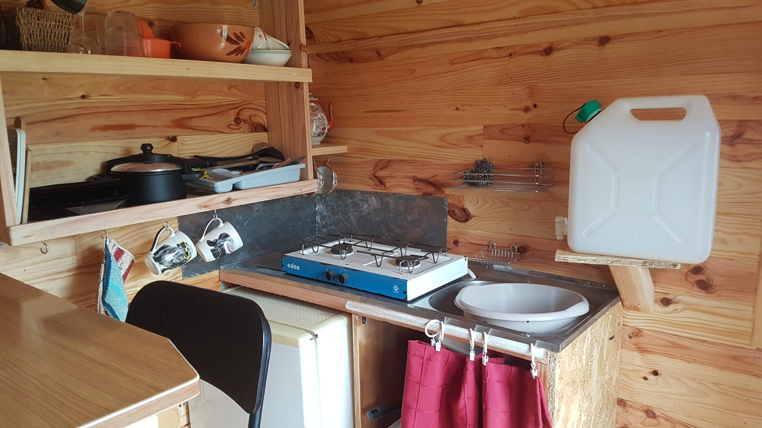 Coin petite cuisine avec jerrican d’eau et 2 feux gaz, vaisselle