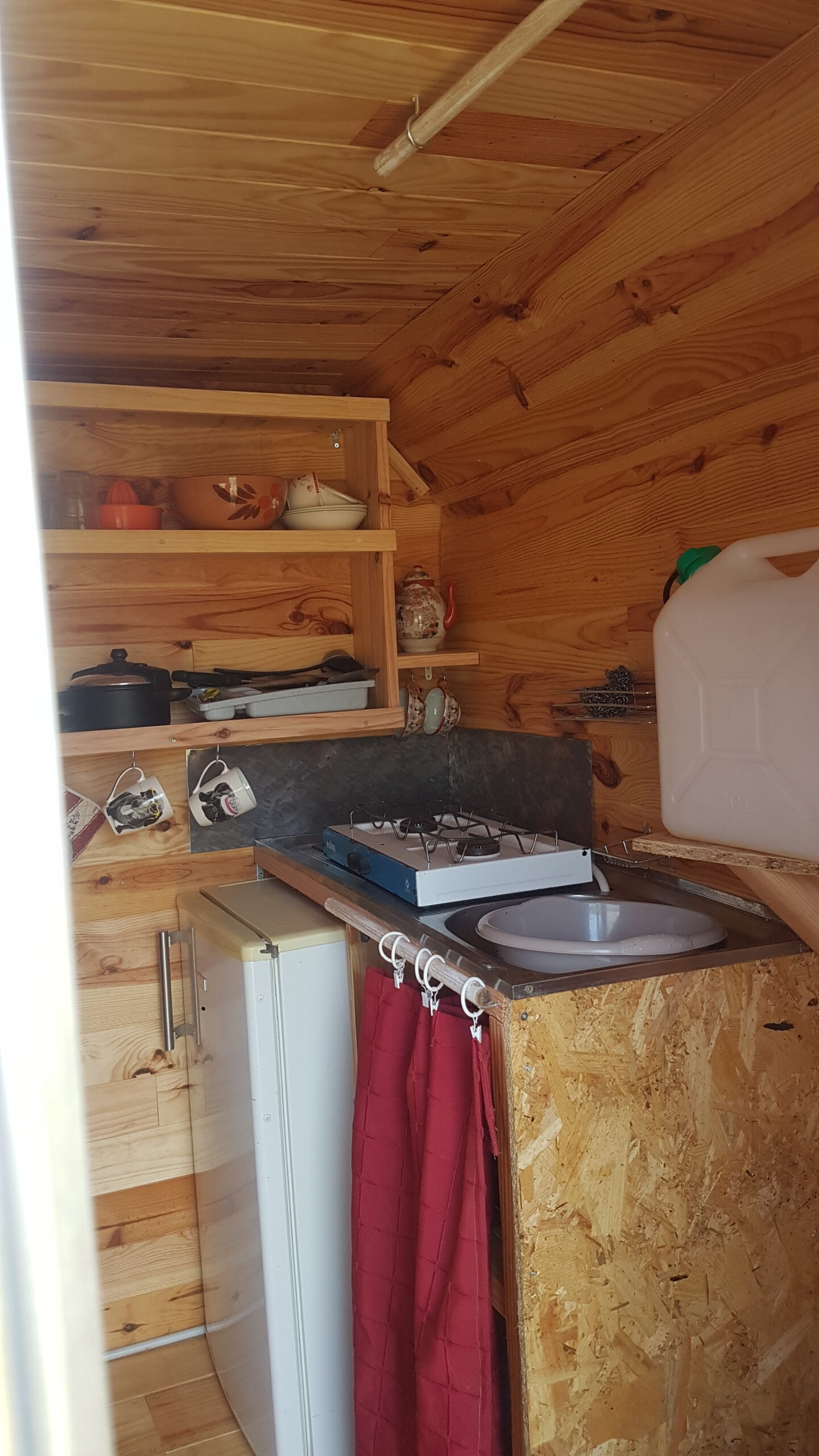 Salle commune avec frigo et possibilité de cuisiner… Vaisselles de récupération à disposition.