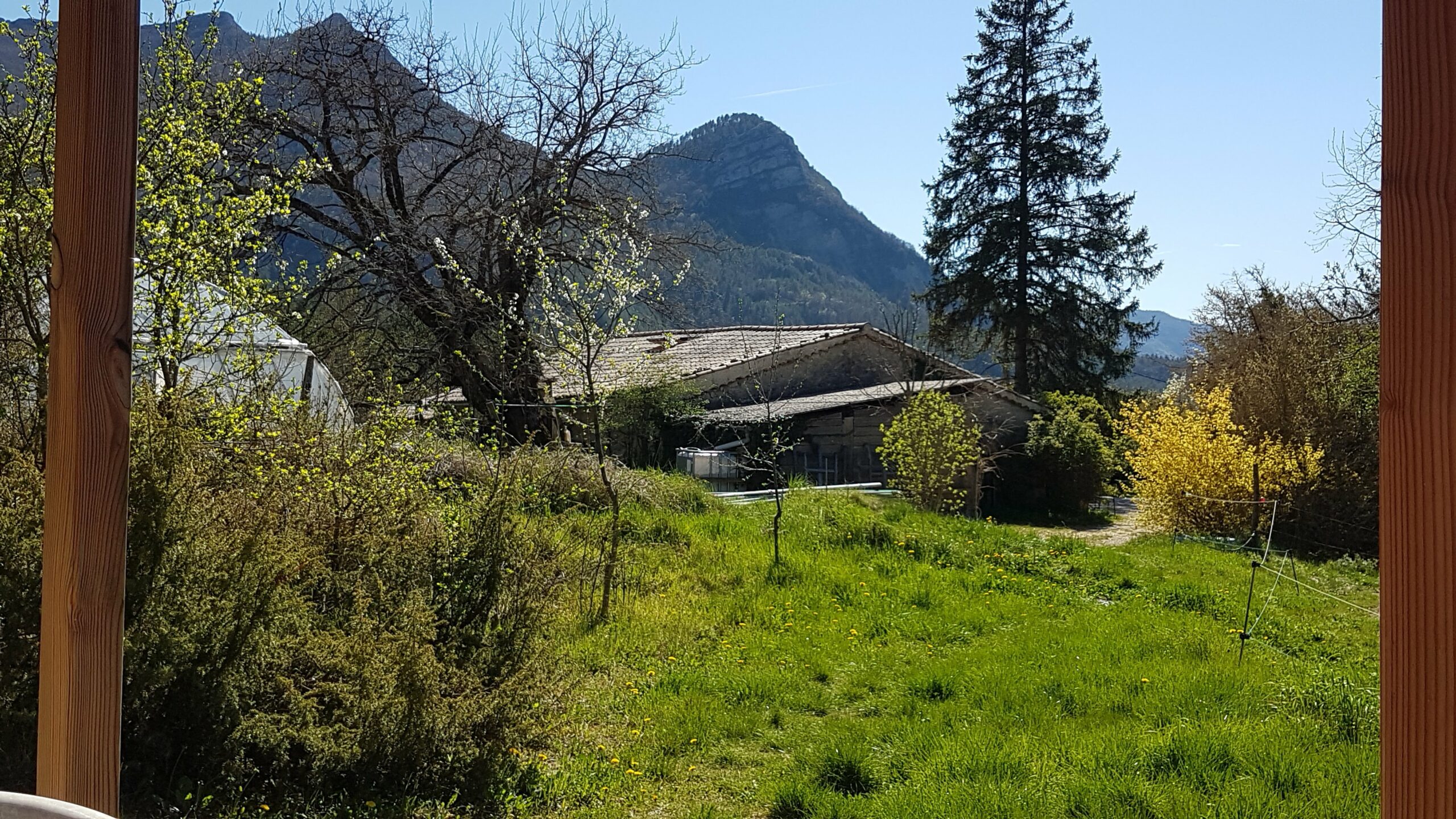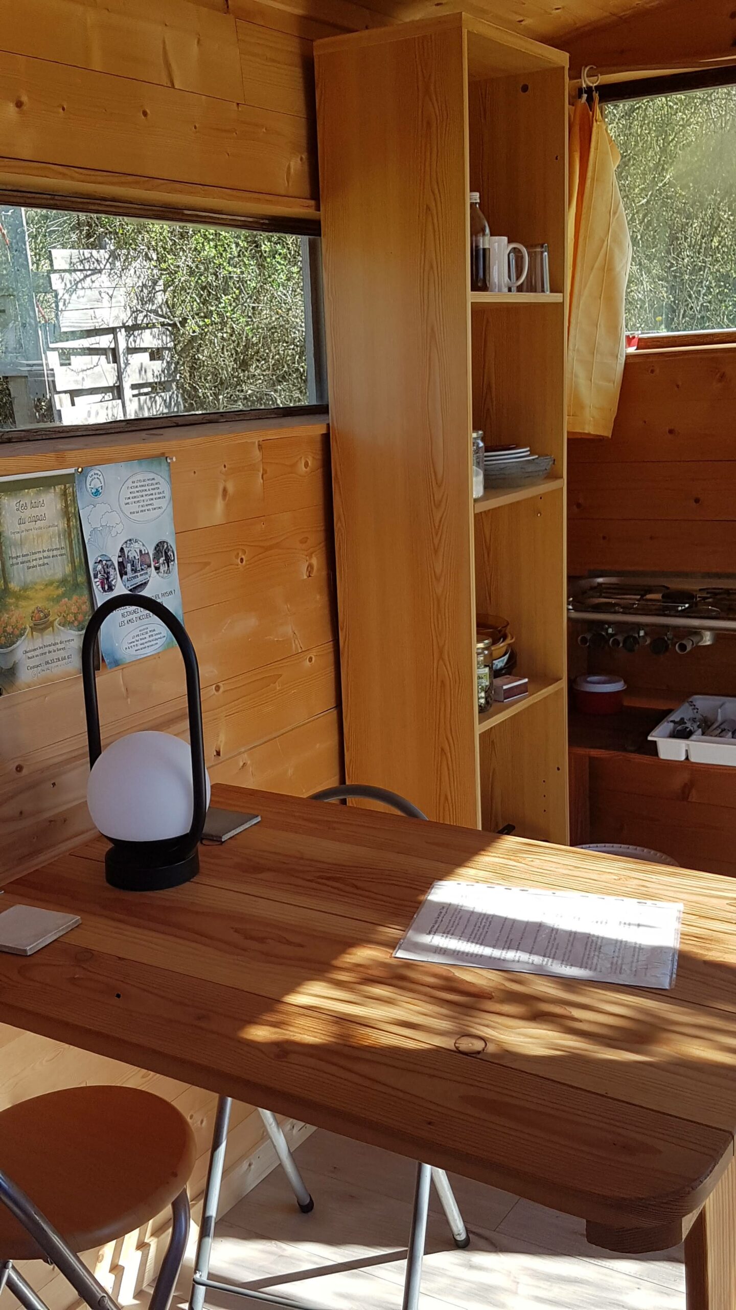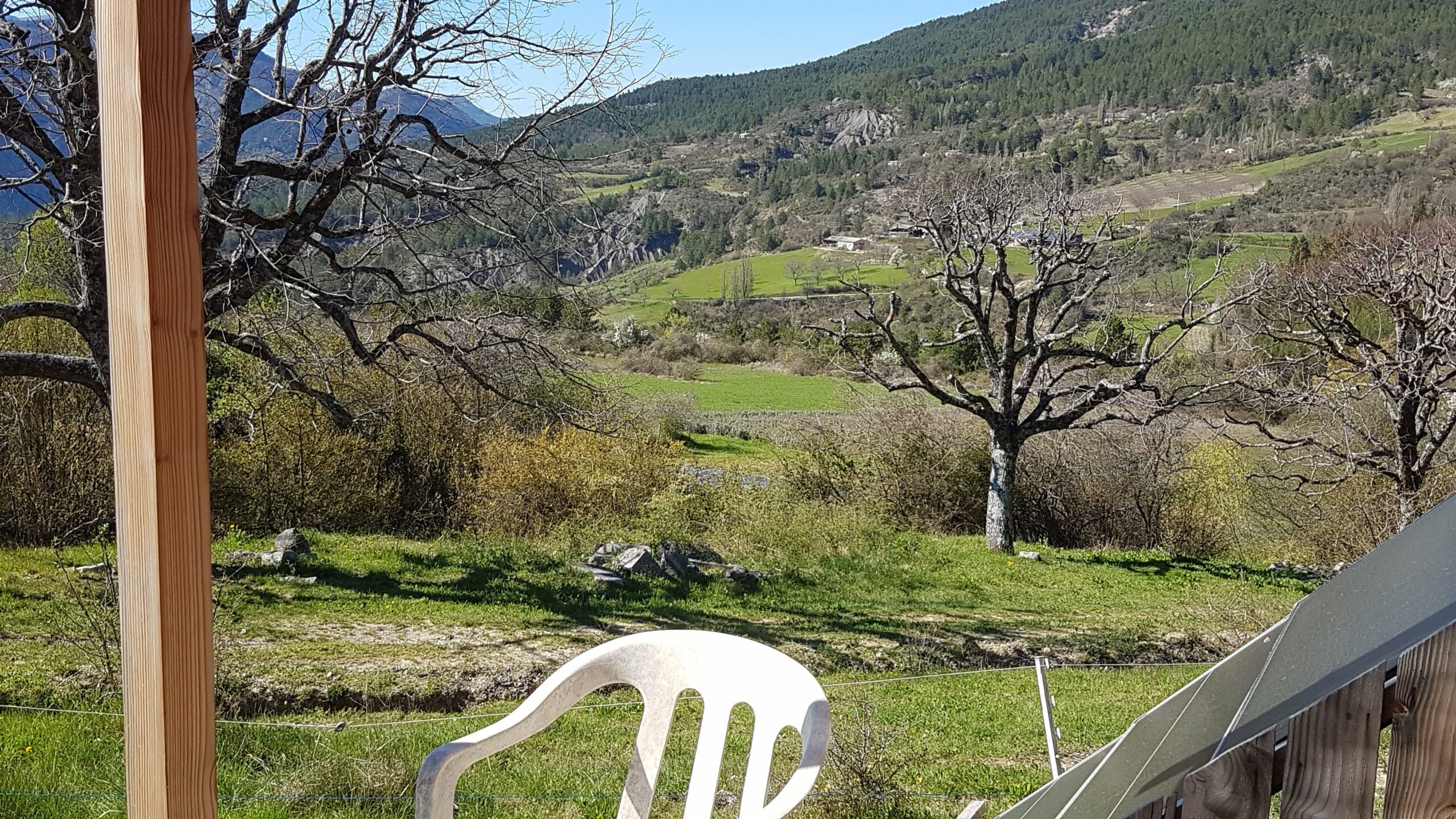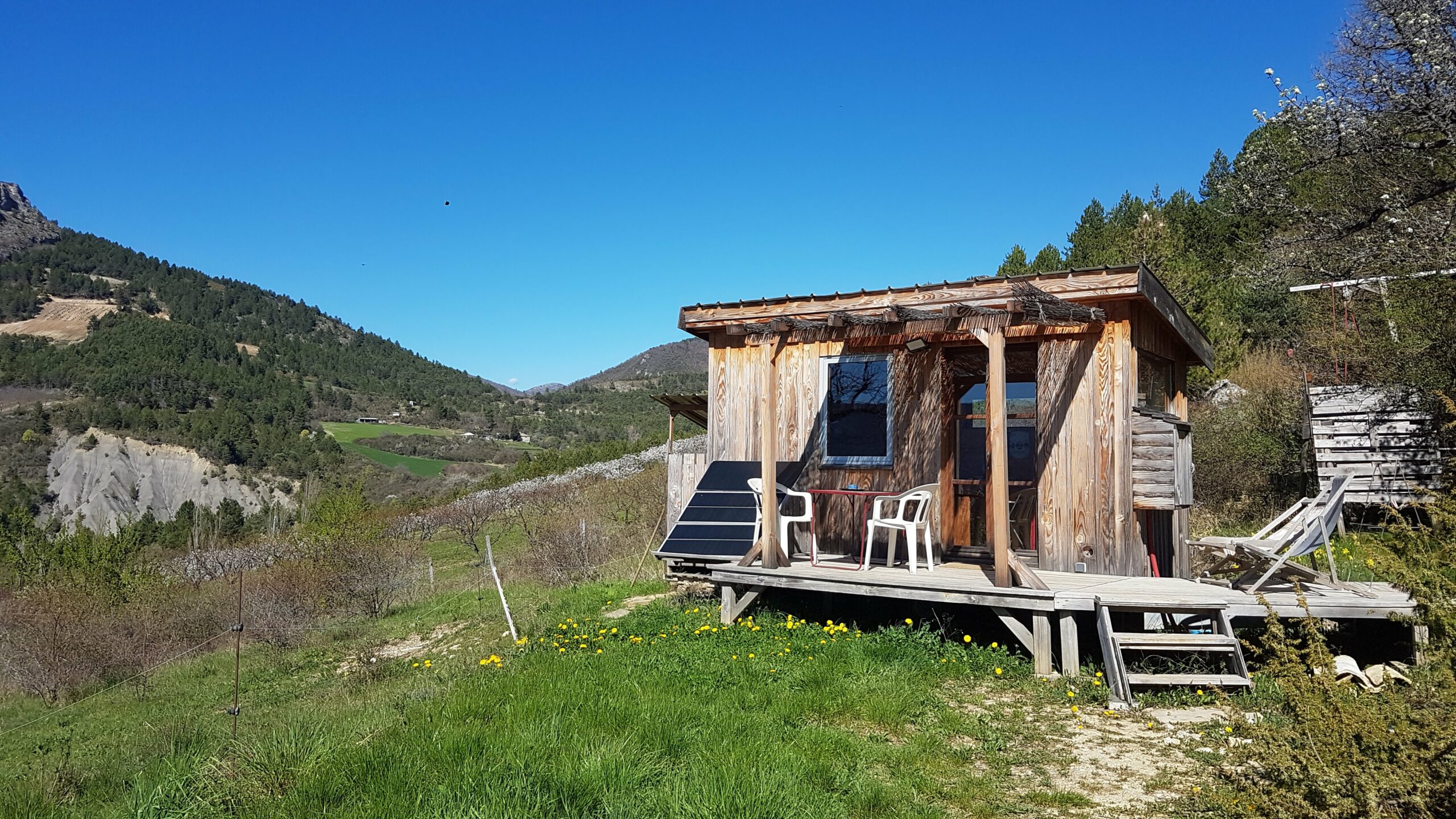 Dans un petit coin dominant la ferme, vue imprenable !! Matériaux bois principalement, isolation écologique, sdb et cuisine équipée, mezzanine couchage 2 places 140×190 et canapé lit 2 places 140×190 dans le salon